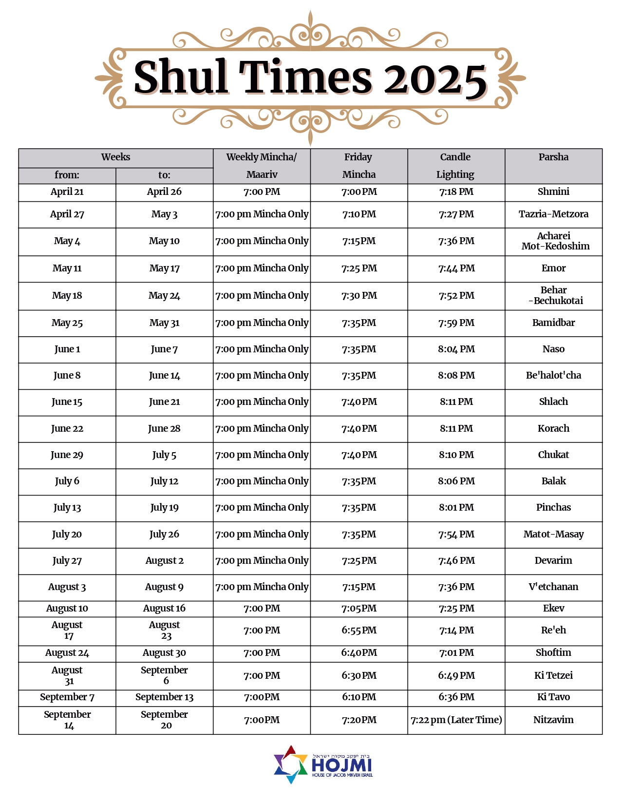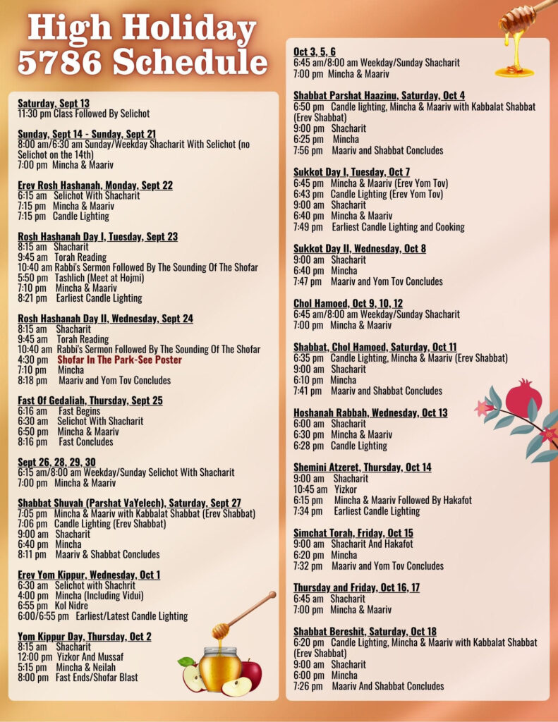 Shul Times and Candle Lighting times 2025